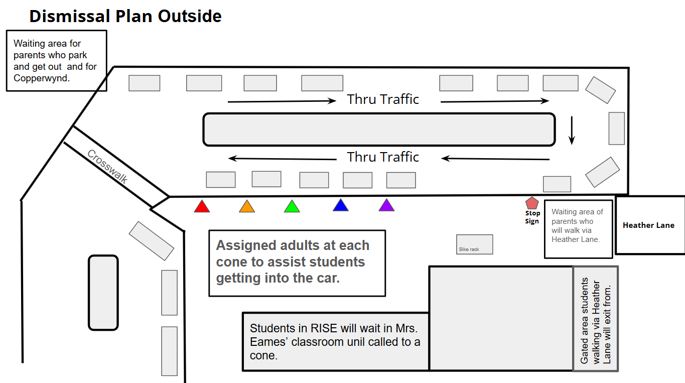 - If you are walking home with your child via Copperwynd, please wait for them on the other side of the crosswalk. If you are walking home via Heather Lane, please wait for them at the designated area behind the bike rack. Our staging area for students in the pick up line needs to be clear for students and staff only.